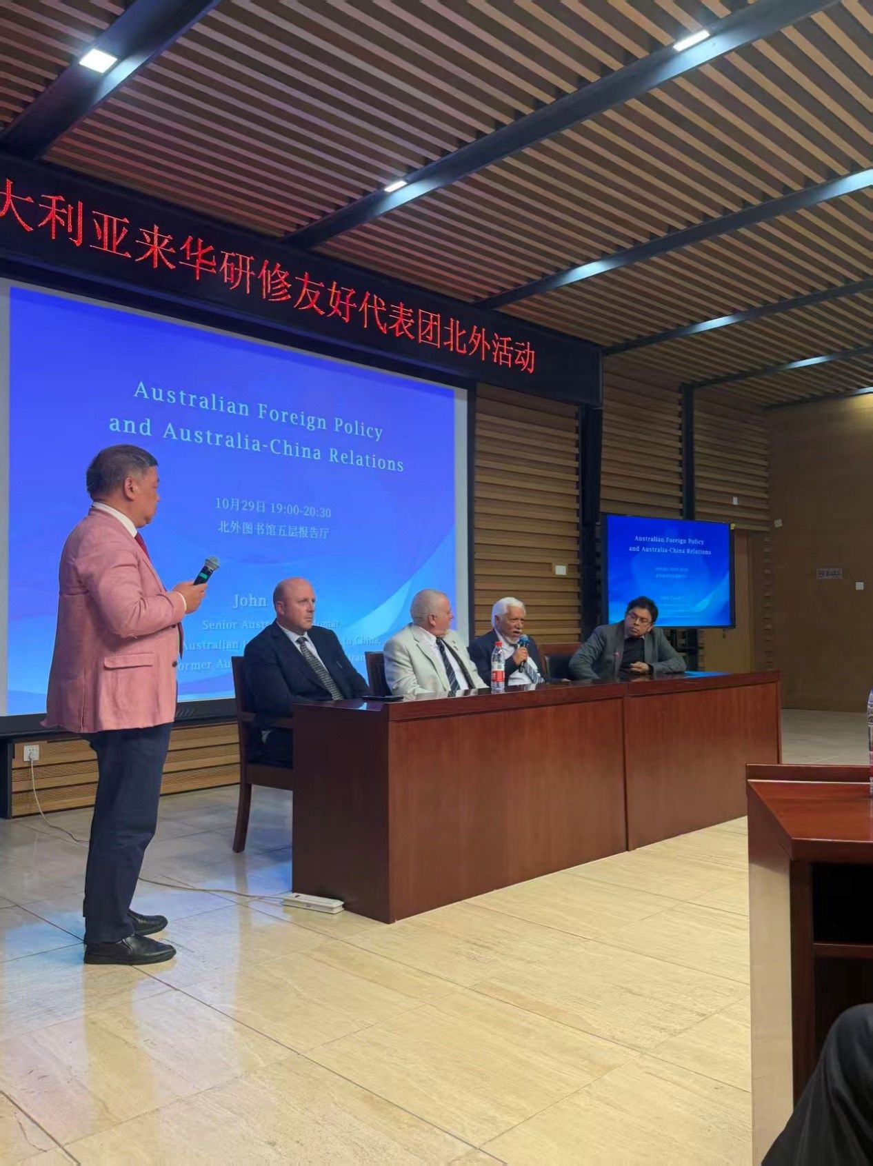图书馆5层学术报告厅举行。代表团团长、首任澳大利亚驻华副大使约翰·兰德(John Lander),代表团副团长、澳大利亚公民党主席罗伯特·巴威克(Robert Barwick),代表团联络人、澳中企业家俱乐部主席袁祖文太平绅士等12位代表团成员,以及北外师生代表出席活动,在热烈友好的氛围中探讨中澳关系、进行跨文化交流。