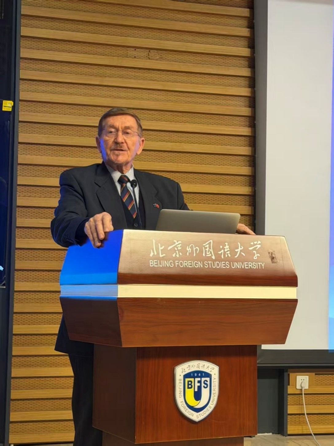 活动核心环节,两位代表团成员分享了精彩的讲座。第一位主讲人约翰·兰德以“澳大利亚外交政策和澳中关系”为主题的演讲。兰德曾在澳大利亚外交贸易部(DFAT)任职30年,出任过驻华使馆副馆长(副大使)、外交贸易部中国处处长。他指出,二战时期中澳就曾作为坚实的盟友共同抗击侵略,现在双方更是重要的贸易合作伙伴,近期澳大利亚领导人访华改善了双边关系。他呼吁澳大利亚采取更加独立的外交政策,主张澳大利亚退出AUKUS,正视中国的重要性,并走向更加独立与合作的外交道路。