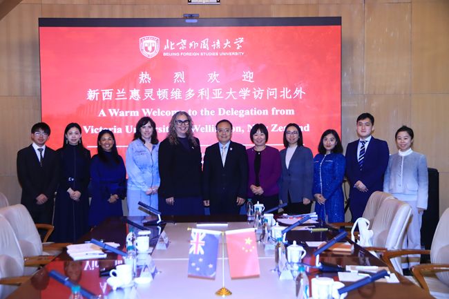 新西兰惠灵顿维多利亚大学国际事务主任埃米·拉瑟福德、全球参与与合作事务副主任乔安娜·兰伯特、中国事务主任曹娟,北外国际交流与合作处副处长龚婧,日本av