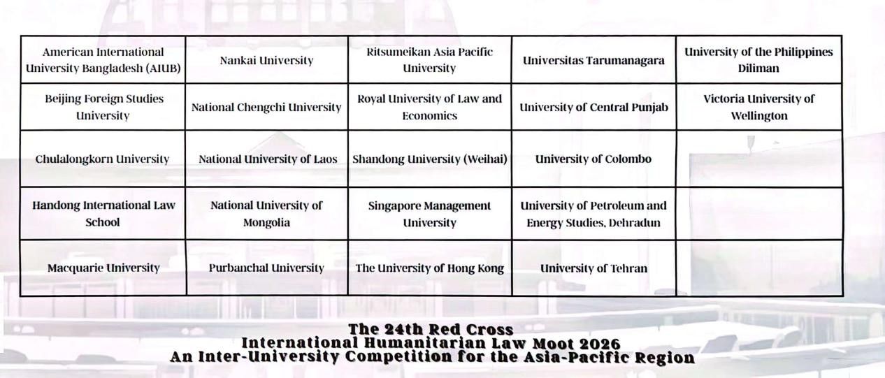 亚太地区红十字国际人道法模拟法庭比赛由红十字国际委员会联合香港红十字会主办,是亚太区域极具影响力的顶级国际法模拟赛事,赛事以模拟国际刑事法院庭审为核心形式,聚焦武装冲突中的国际人道法核心议题,全面考察参赛选手的专业素养与实战能力。