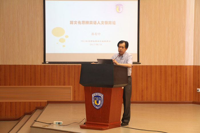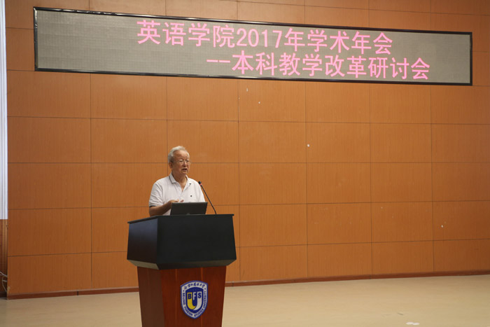 ——副校长孙有中教授做了主题为“论跨文化思辨英语人文教育”的重要发言。他指出,英语教育中的知识学习应该与语言学习融合,而不是先语言、后知识。随着形势的变化和生源质量的提高,人文素养和思辨能力的培养已经成为英语教育的主流。英语专业学生的质量不仅要体现在高超的语言能力上,还应表现在宽广的人文知识素养、敏锐的思辨能力、跨文化国际视野以及创新思维等方面。