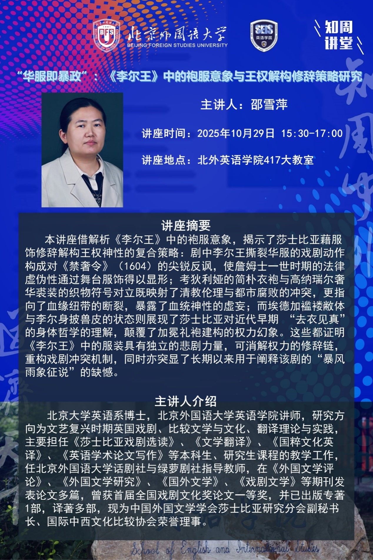 10月29日讲座:“华服即暴政”:《李尔王》中的袍服意象与王权解构修辞策略研究